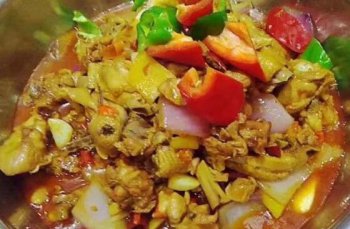 7. 加入鸡块中火煸炒1分钟,入味精、盐、胡萝卜块翻炒均匀即可。